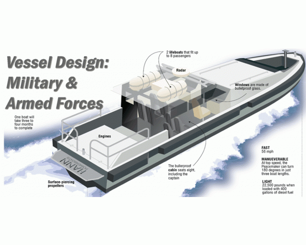 If you were confronted with an incident twelve nautical miles away, would reduce the transit time by almost ten minutes be a benefit? If the incident were a terrorist attack, a fire, or a rescue mission, the ten minutes could make a big difference in the outcome. If you had to intercept a target 100 miles away, would closing on the target at 50 knots or more be a benefit? Do you need an all-weather, high-speed, diesel-efficient, medium-range aluminum military boat? The Hann 40 Peacemaker is new, and it truly delivers high-speed, stable performance in a coastal military boat. You can now achieve 50 knot performance and conduct harbor protection offshore, before trouble gets to your harbor. Do you require any of these capabilities?